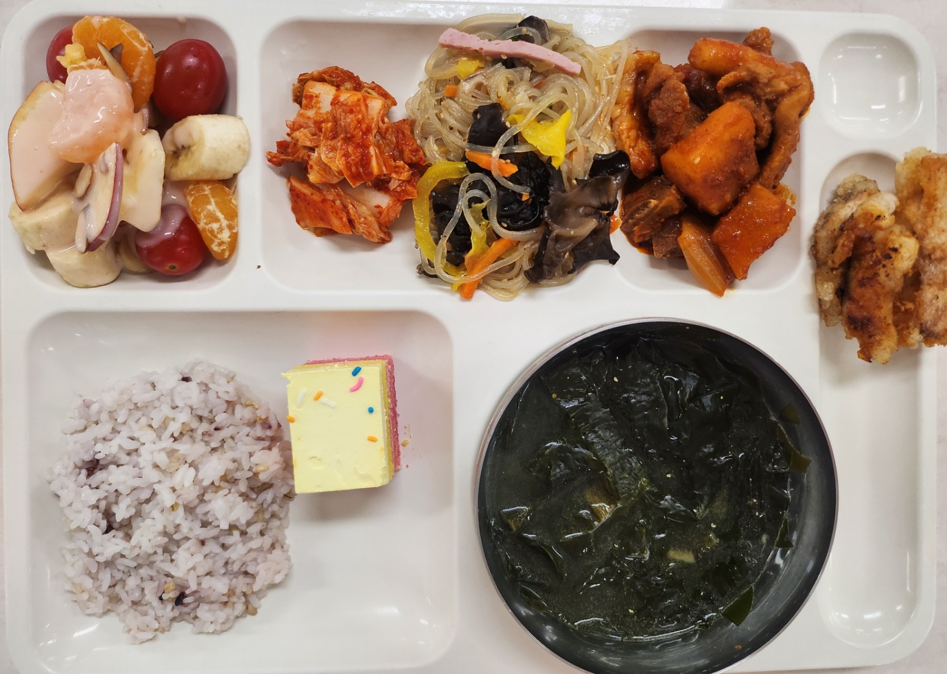 혼합잡곡밥(5) 미역국(8.9.18) 매콤돼지갈비찜1(5.6.10.13) 과일샐러드1(1.2.5.6.11.12) 버섯잡채1(1.2.5.6.10.15.16) *적어구이(자율)30g 배추김치(완제)(9) 딸,바케이크(1.2.5.6)
