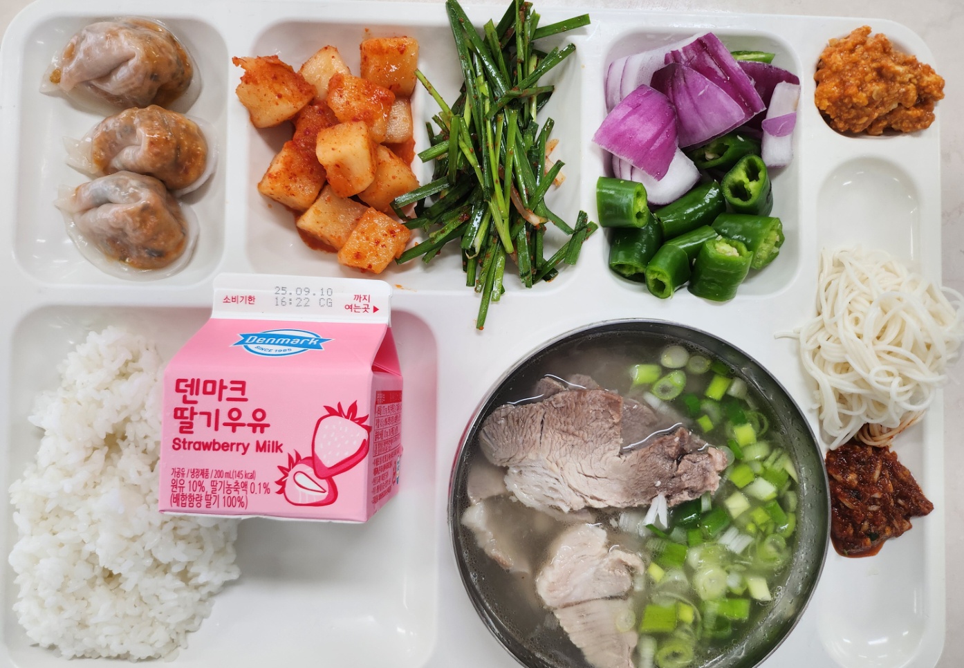 찹쌀밥 돼지국밥+소면사리(5.6.9.10) 김치만두(1.5.6.10.18) 깍두기(9) 부추겉절이 딸기우유190ml(퓨)(2) *야채스틱(적양파,아삭고추)쌈장(5.6.13)