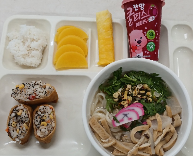 궁채유부초밥(2P)사각(1.2.5.6.9.13.16.18) 자율밥 우동(1.2.5.6.8.9.18) 단무지 골드파인애플스틱 쿨피스에이드300ml/자두맛