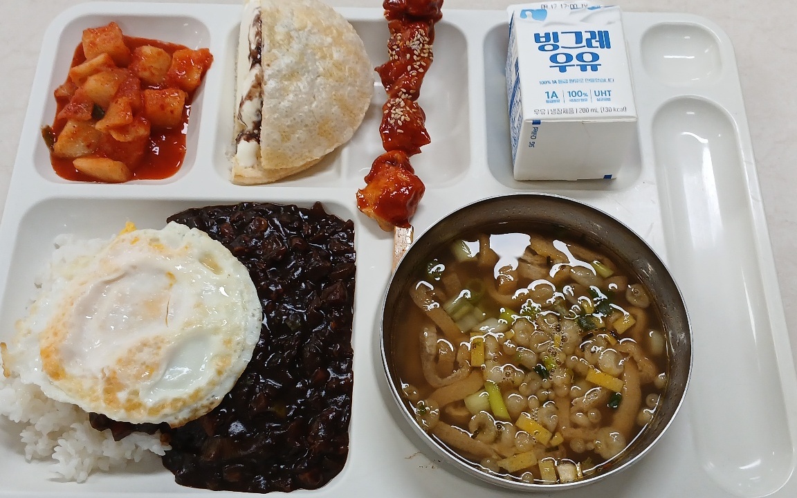 자장밥(5.6.10.13.16) 숯불닭꼬치70g(5.6.15) 계란후라이(친환경)(1) 깍두기(9) 뻥스크림(바닐라+초코)(1.2.5.6) 우유