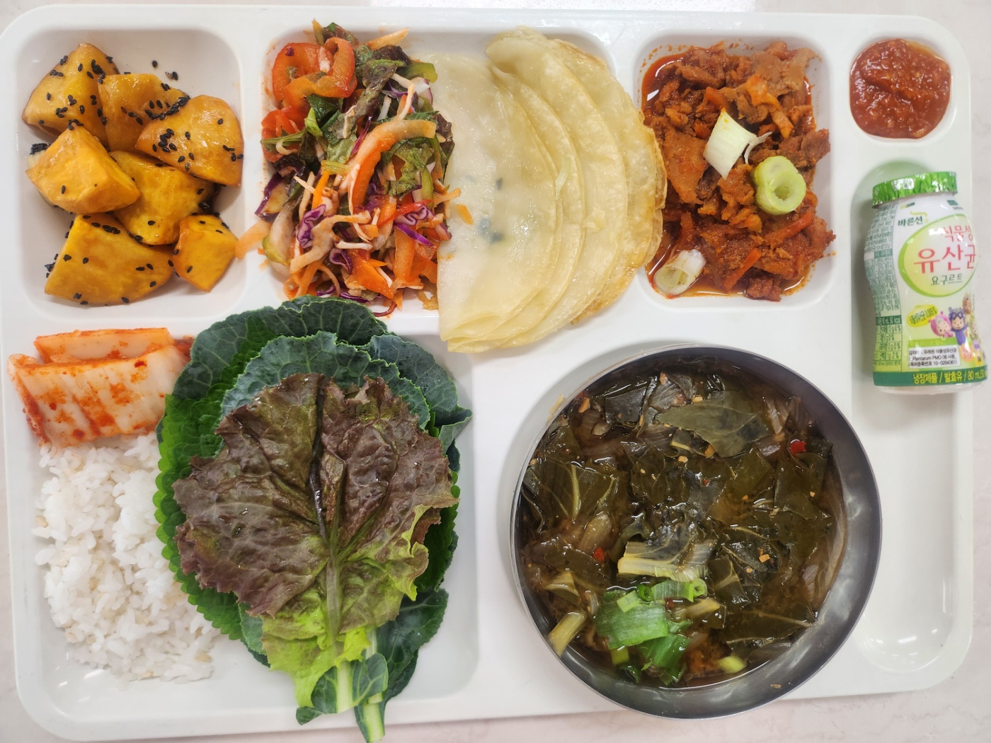 현미밥 근대된장국(5.6.8.9.18) 쌈싸먹는납작만두+채소무침(1.5.6.13) 제육불고기(5.6.10.13) 고구마맛탕(13) 배추김치(완제)(9) 식물성유산균요구르트23(80g)(2) *모듬쌈(깻,케,당,상)(자율)