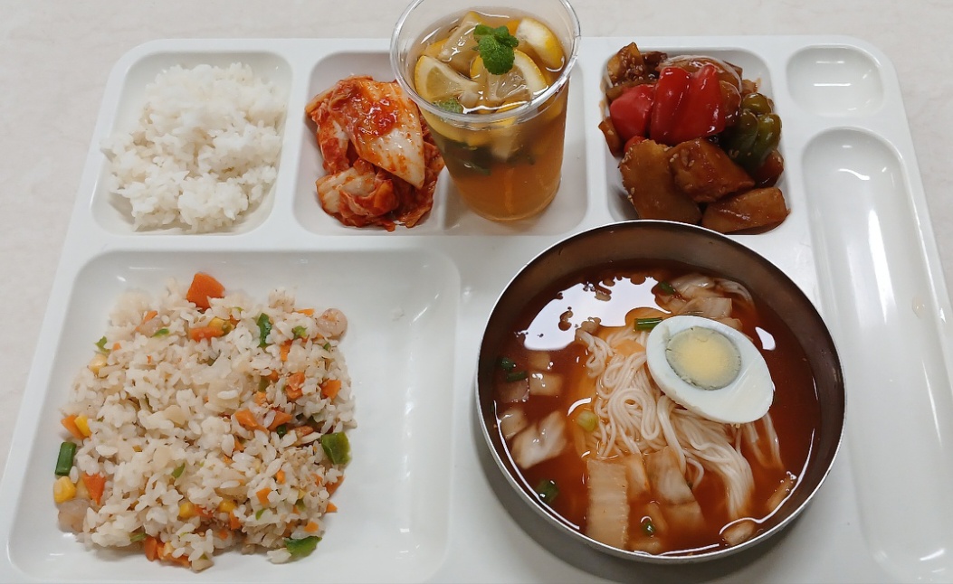 야채새우볶음밥(5.6.9.13.18) 김치말이국수(미니)(1.5.6.9.16) 미트볼피망조림(1.2.5.6.10.12.13.15.16) 배추김치(완제)(9) 레몬아이스티