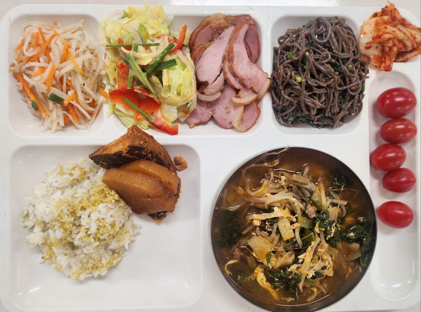 기장밥 들기름막국수(3.6) 육개장(1.8.9.16.18) 돈육훈제무침(1.2.5.6.10) 감자채볶음 배추김치(완제)(9) 대추방울토마토(지원센터24)(12)