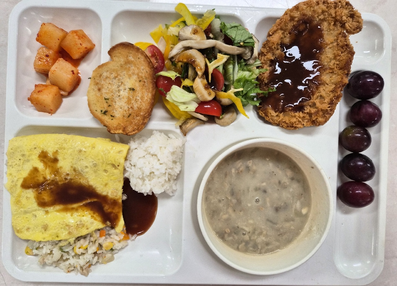 오므라이스(1.2.5.6.10.12.13.15.16.18) 양송이스프(2.5.6.13.16) 마늘빵(2.5.6) 구운버섯샐러드+발사믹드레싱(1.2.5.6.12) 제주돼지통등심돈까스+소스(1.5.6.10.12.13.18) 깍두기(9) 거봉(김해시)