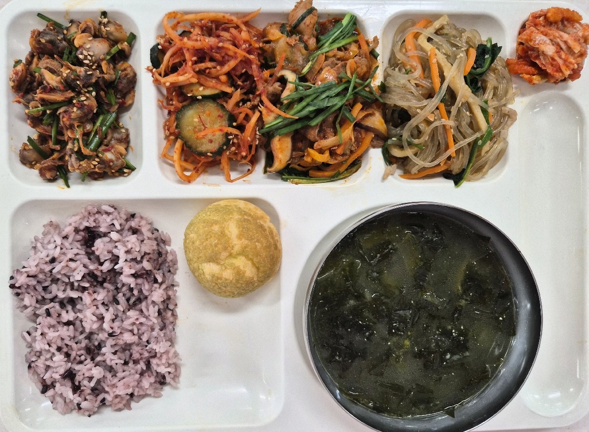 검정쌀밥 미역국(8.9.18) 오이도라지무침(5.6.13) 한식잡채24(1.5.6.10.13) 오리불고기(5.6.13) 배추김치(완제)(9) 비스킷아이스슈(1.2.5.6) *꼬막무침(자율무침)(5.6.13.18)