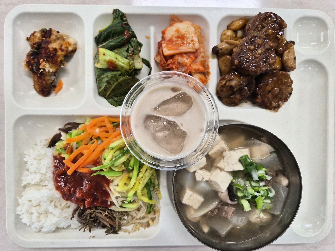 나물비빔밥+고추장(5.6.10) 쇠고기탕국(5.8.9.13.16.18) 떡갈비조림+새송이버섯(1.2.5.6.10.13.15.16.18) 삼치구이*양념장(자율)(5.6) 청경채겉절이(5.6.13) 배추김치(완제)(9) 미숫가루라떼23(2.5.13)