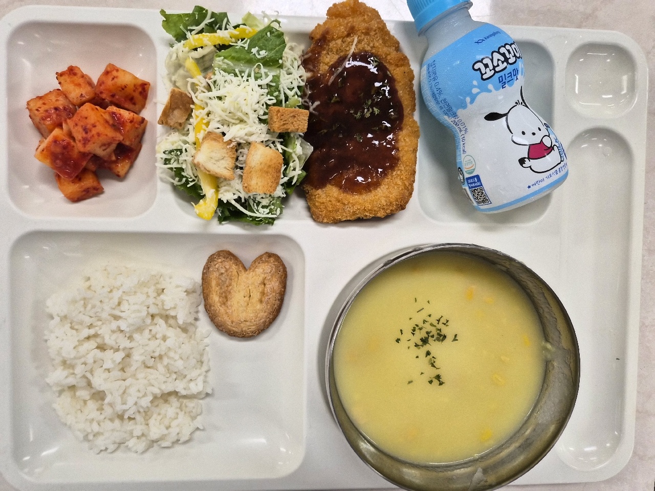 찹쌀밥 옥수수스프(2.5.6.16) 시저샐러드(1.2.5.6.12) 치킨가스(오븐)(1.5.6.12.13.15.18) 깍두기(9) 하트파이(완)(1.2.5.6) 밀크맛음료200ml(12)