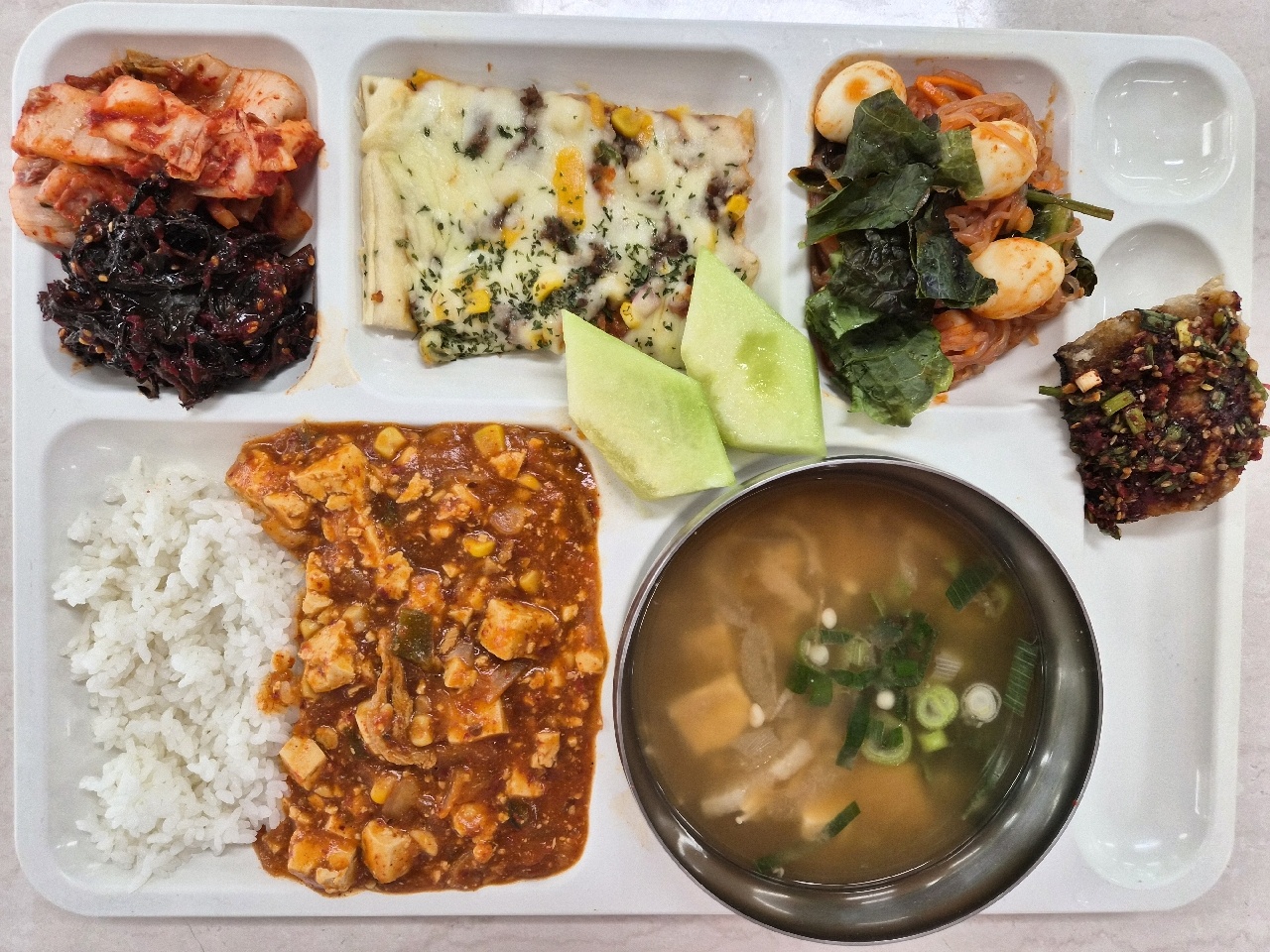 팽이버섯된장국(5.6.8.9.18) 삼치구이*양념장(자율)(5.6) 실곤약메추리알무침(1.5.6.13) 마파두부덮밥(5.6.10.12.13.18) 트리플사각조각피자(1.2.5.6.10.12.13.15.16) 배추김치(완제)(9) *고들빼기김치(자율)(9) 멜론(협약)