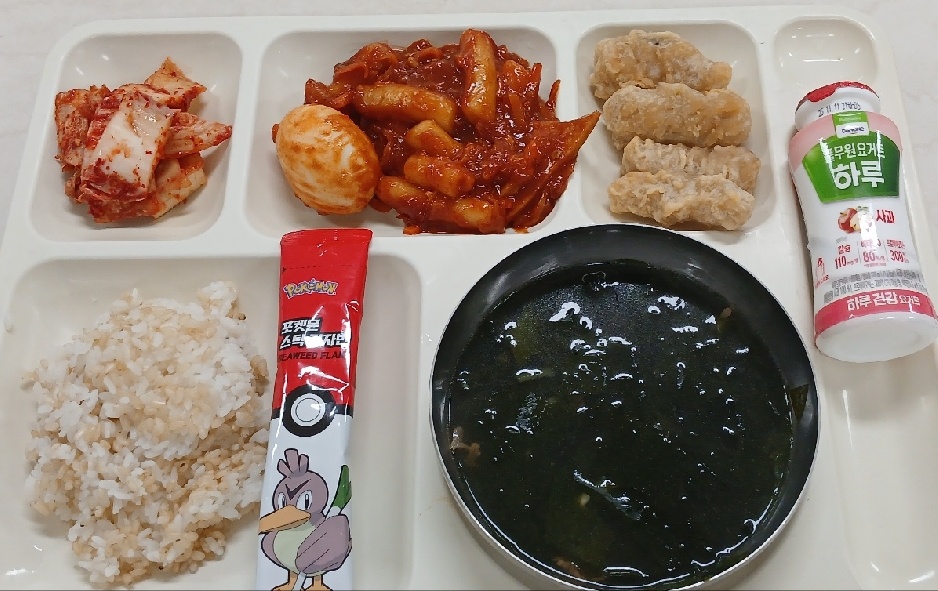 현미밥 한우미역국(5.6.8.9.16.18) 계란떡볶이24년(1.2.5.6.13) 찹쌀오징어튀김(1.5.6.17) 배추김치(완제)(9) 마시는요구르트l(2) 김자반스틱(5)