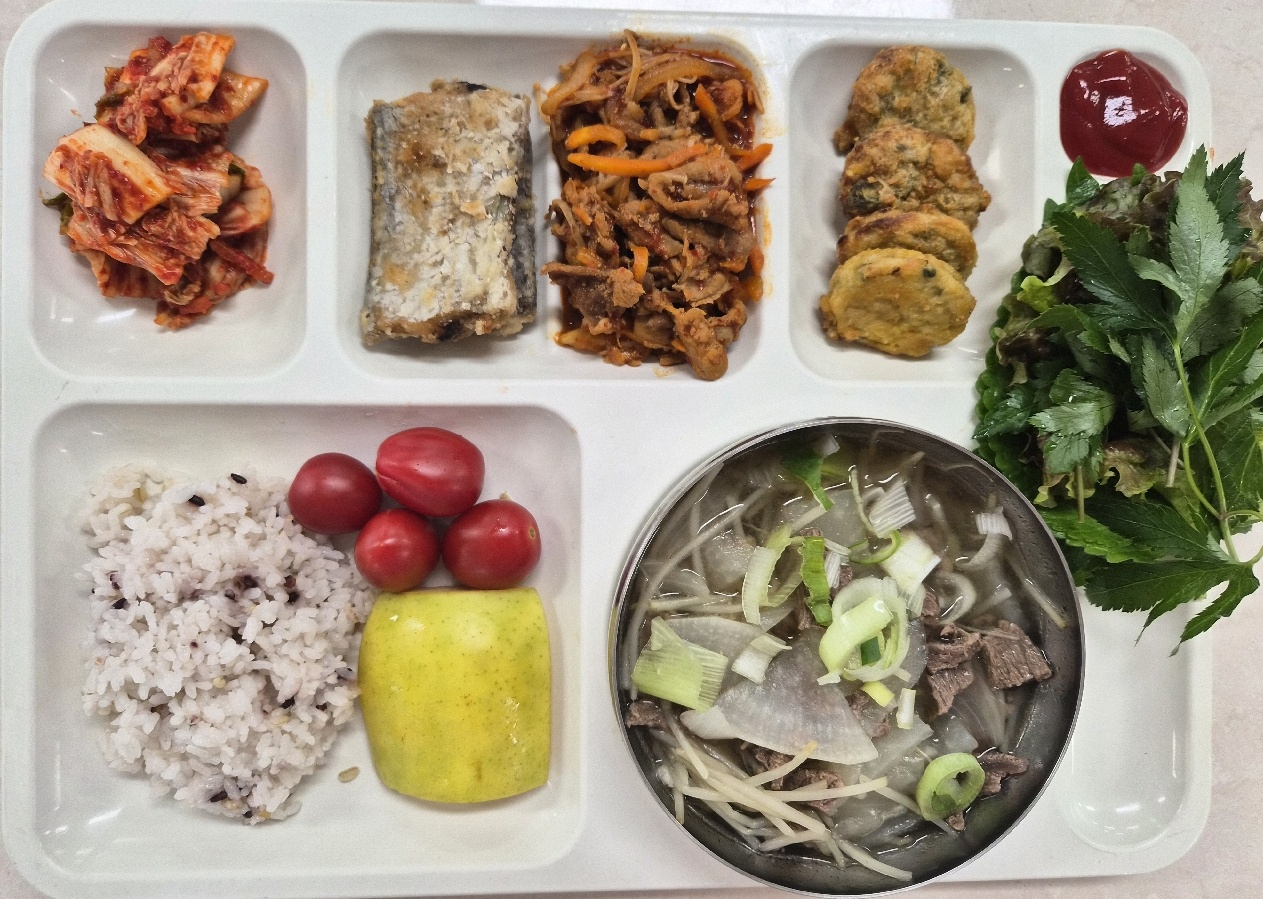혼합잡곡밥(5) 맑은소고기무국(5.8.9.16.18) 돈육불고기1(5.6.10.13) 에그동그랑땡전+케첩(1.2.5.6.8.10.12.15.16) (자율)갈치구이(6) 배추김치(완제)(9) *모듬쌈(깻,케,당,상)(자율) 사과(부사)&방울토마토(12)