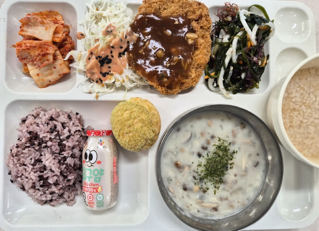 검정쌀밥 머쉬룸크림스프(2.5.6.13.16) 옛날식양배추샐러드(1.4.5.12) 왕돈까스+야구르트100ml(1.2.5.6.10.12.13.18) 배추김치(완제)(9) 비스킷아이스슈(1.2.5.6) 요구르트(요구100ml)(2) 숭늉(자율) *모듬해초무침(자율)(13)