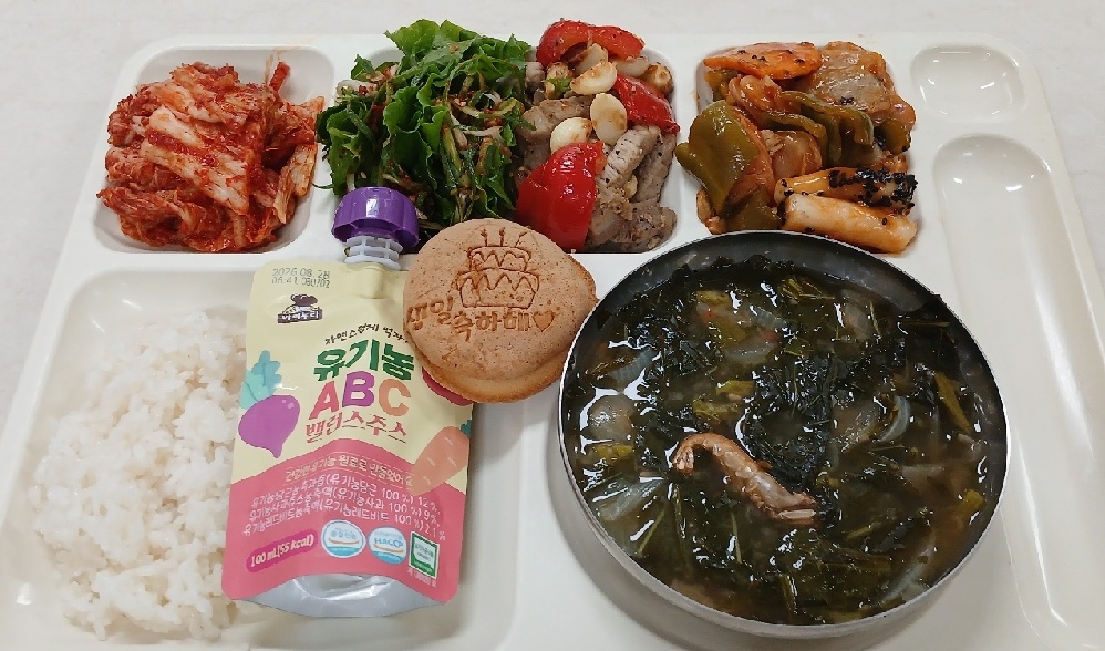 석식 찹쌀밥 건새우아욱국1(5.6.8.9.18) 상추대파채겉절이(13) 소시지볶음(2.5.6.10.12.13.15.16) 한입돈육구이(24년)(10) 배추김치(완제)(9) 과채밸런스주스(13)