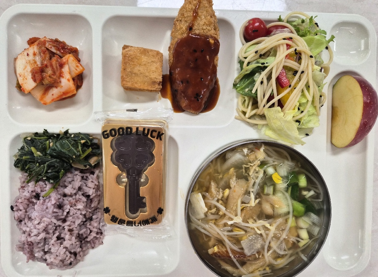 검정쌀밥 황태콩나물국(1.5.6.8.9.18) 샐러드파스타(1.5.6.12) 케이준대구까스+바베큐소스(1.5.6.12.13) 멘보샤(1.2.5.6.9) 배추김치(완제)(9) 행운초콜릿(2.5) 사과(부사)