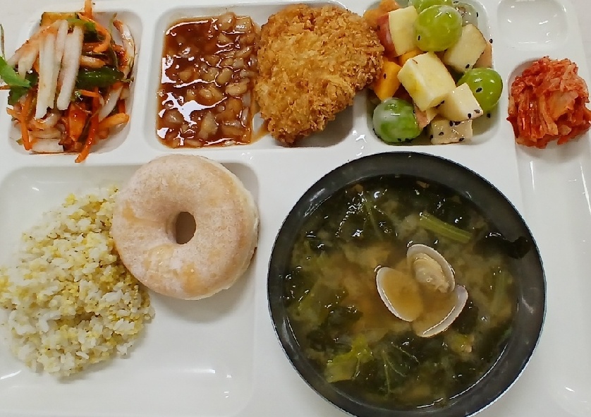 기장밥 글레이즈도넛(1.2.5.6) 단배추된장국(5.6.8.9.18) 과일요거트범벅(1.2.5.6) 오징어채소무침(5.6.13.17) 제주돼지통등심돈까스+소스(1.5.6.10.12.13.18) 배추김치(완제)(9)