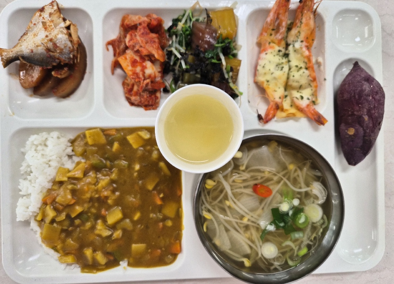 버섯카레라이스(1.2.5.6.12.13.16) 친환경콩나물국1(5.6.8.9.18) 병어조림(자율) 청포묵무침(5.6) 버터플라이새우구이(수제)(1.2.5.9) 배추김치(완제)(9) 수제유자차(13) 아이스군고구마(5)
