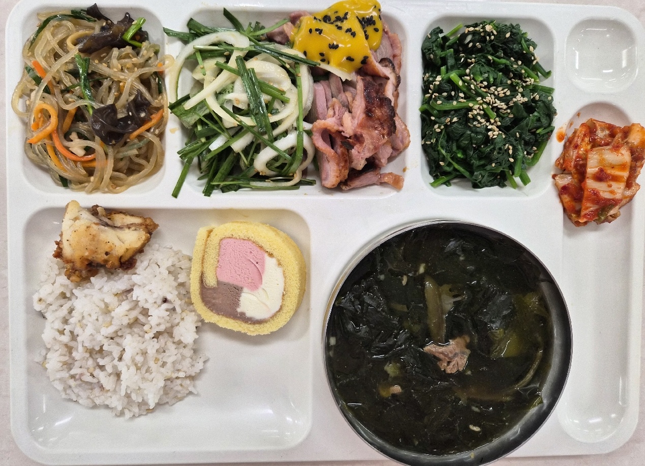 혼합잡곡밥(5) 한우미역국(5.6.8.9.16.18) 부추양파겉절이(와사비)(5.6.13) 시금치나물 한식잡채24(1.5.6.10.13) *적어구이(자율)30g 통오리바베큐(1.2.5.6) 배추김치(완제)(9) 딸기아이스크림롤케이크(2.5.6)