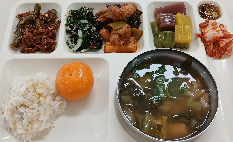 기장밥 두부된장국(5.6.8.9.18) *물파래무침(자율)(13) 청포묵양념장(5.6) 마라샹궈찜닭(분모자)(1.2.5.6.10.15.16) 꽈리고추멸치볶음(5.6.13) 배추김치(완제)(9) 귤