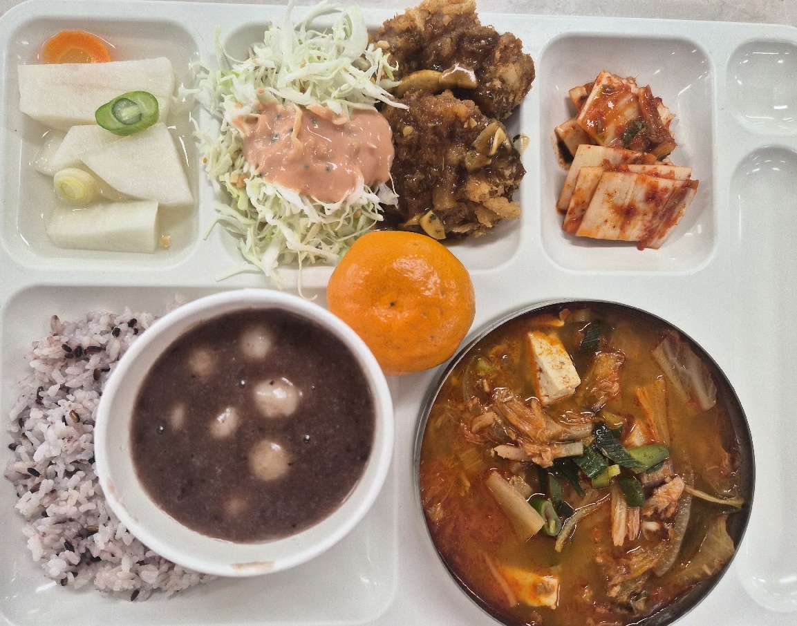 검정쌀밥 동지팥죽 참치김치찌개3(5.8.9.18) 옛날식양배추샐러드(1.4.5.12) 안심돈까스(1.2.5.6.10.12.13.18) 배추김치(완제)(9) *동치미(자율)(9) 귤