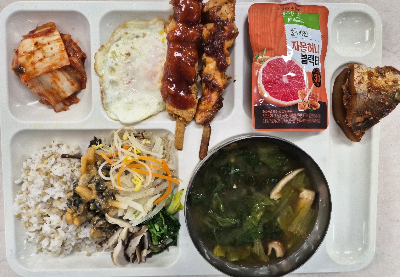 보리밥+나물비빔밥+강된장(5.6.10) 시락국*자율(5.6.8.9.18) 병어조림(자율) 후라이드닭꼬치(5.6.15) 달걀후라이(21지원센터)(1) 마라양념닭꼬치(5.6.15) 배추김치(완제)(9) 자몽허니블랙티/음료(13)