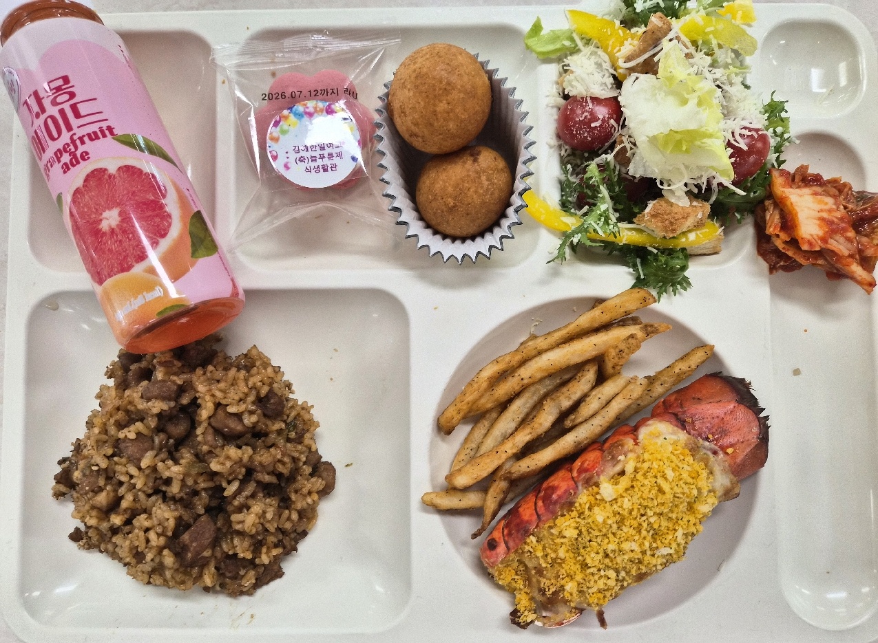 불고기필라프(5.6.10.12.13.16.18)시저샐러드(1.2.5.6.12) 케이준감자튀김(5.6.12) 모짜렐라치즈볼(1.2.5.6) 황금랍스터치즈구이(1.2.5.6.13) 배추김치(완제)(9) 요거트딸기꽃카롱(1.2.6) 자몽에이드(13)