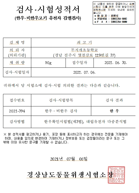 2021. 1학기 한우,비한우 유전자 검사 결과
