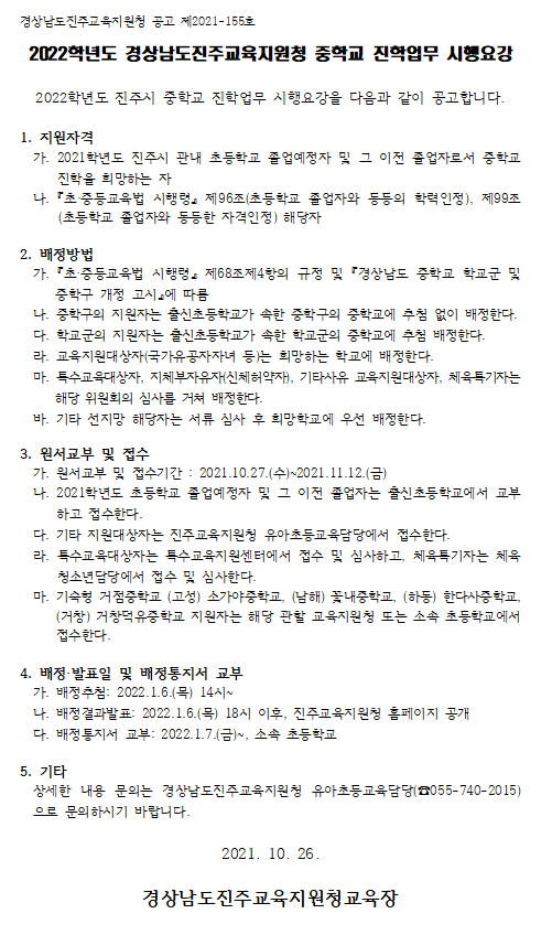 경상남도진주교육지원청 교육지원과_2022학년도 중학교 진학업무 시행요강 공고(최종).hwp