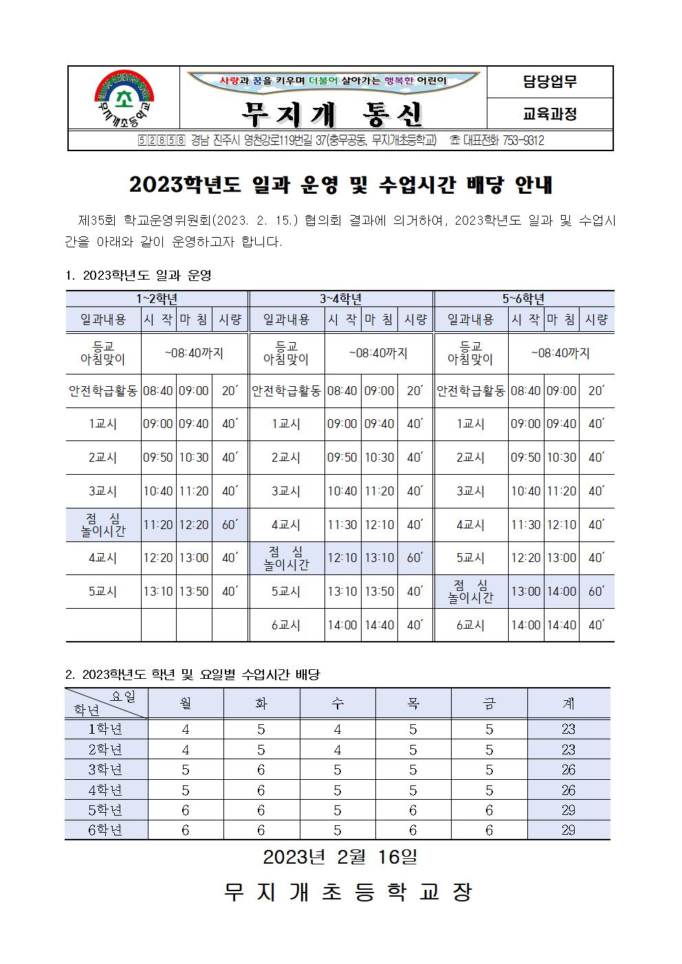 2023학년도 일과 운영 및 수업시간 배당 안내 가정통신문