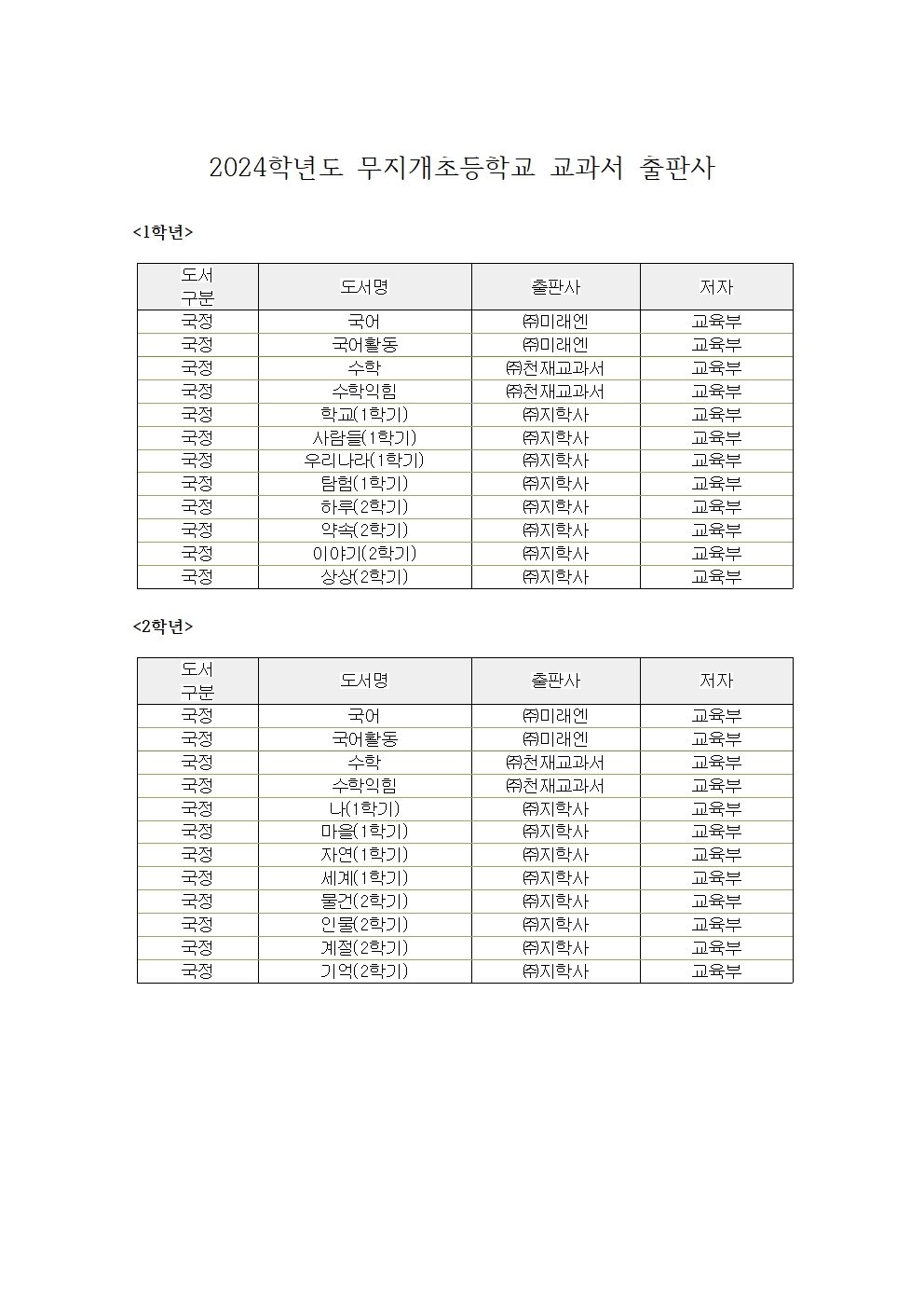 2024학년도 무지개초등학교 교과서 출판사 안내