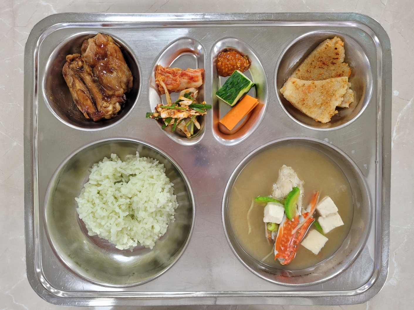 2024년7월8일(월) 식단: 클로렐라쌀밥, 꽃게된장국, 숯불스테이크, 양배추부추무침, 감자전, 배추김치, 오이당근스틱(자)