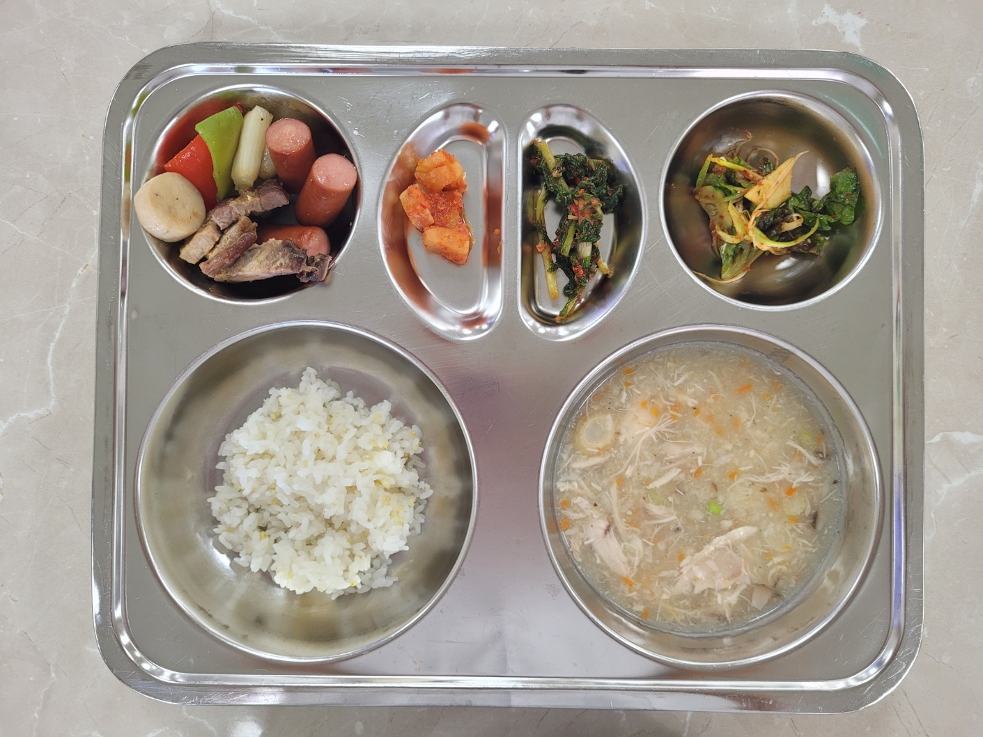 2024년8월26일 (월) 식단: 기장밥, 삼계탕, 상추겉절이, 캠핑모듬구이, 깍두기, 열무김치(자)