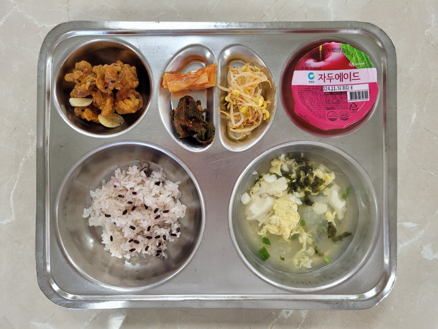 2024년8월28일 (수) 식단: 발아흑미밥, 순두부달걀탕, 콩나물무침, 갈릭치킨, 깻잎김치(자), 배추김치, 미니자두음료
