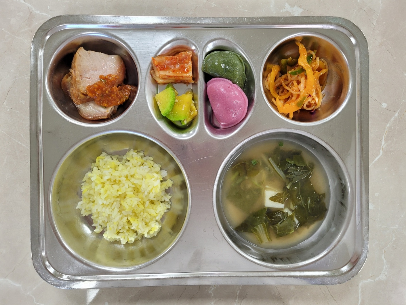 2024년8월29일 (목) 식단: 강황쌀밥, 아욱국, 족발/쌈장, 비빔뽈면, 애호박나물, 배추김치, 바람떡