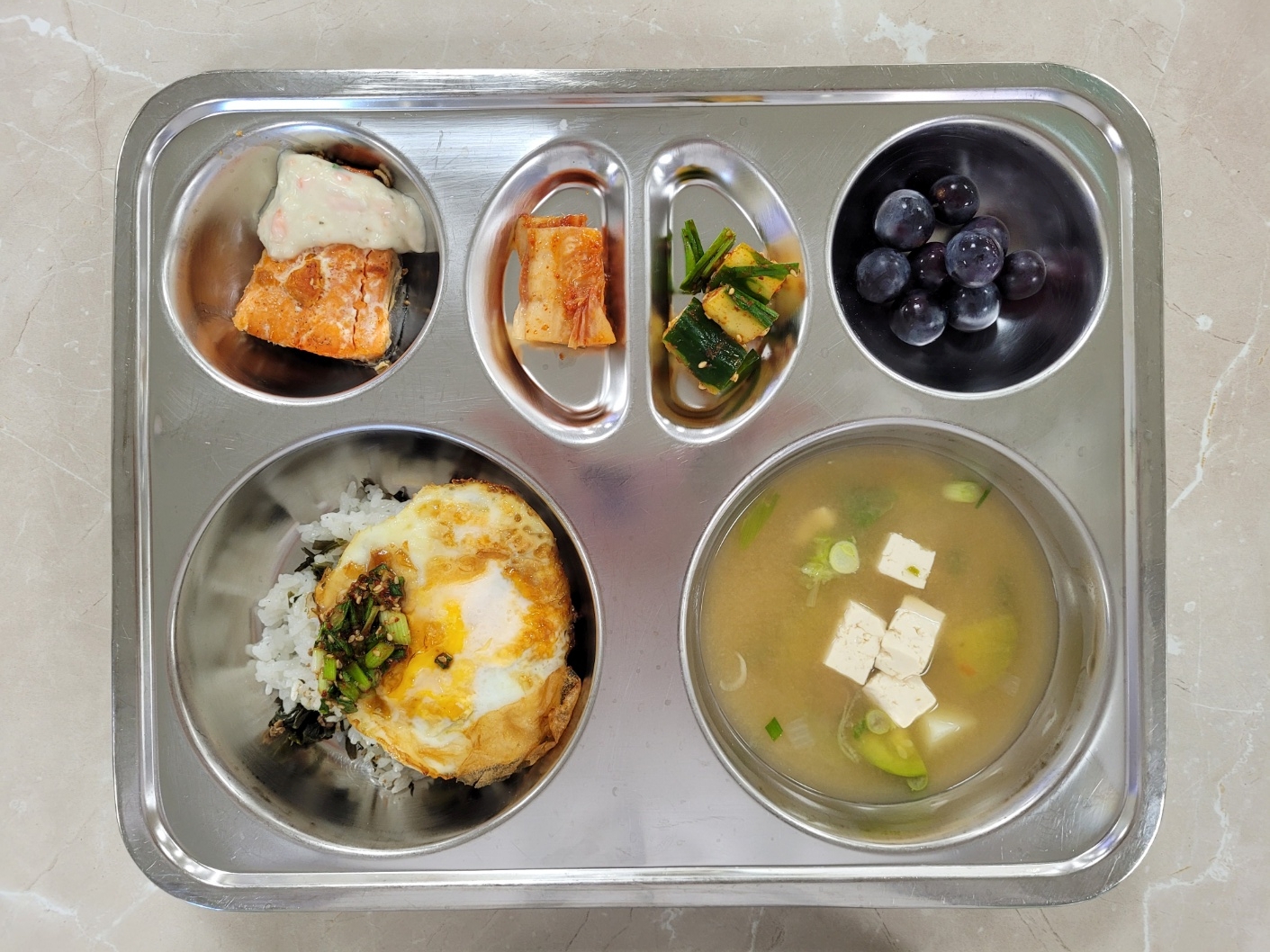 2024년8월30일 (금) 다채롭데이식단: 곤드레밥/양념장/계란구이, 감자애호박된장국, 오이소박이, 연어스테이크/소스, 배추김치, 포도