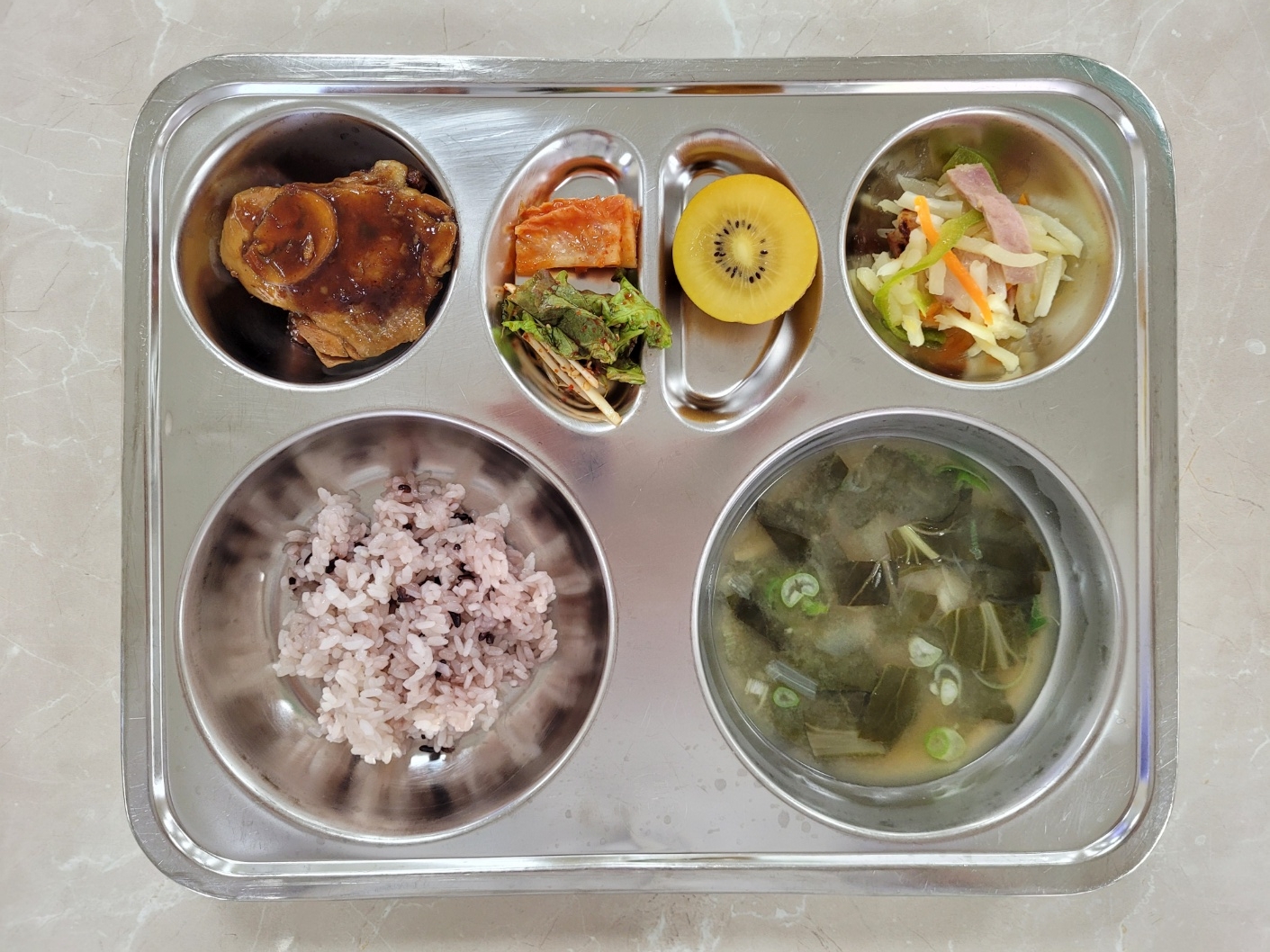 2024년9월2일 (월) 식단: 발아흑미밥, 근대된장국, 숯불스테이크, 상추파절이, 감자채베이컨볶음, 배추김치, 골드키위