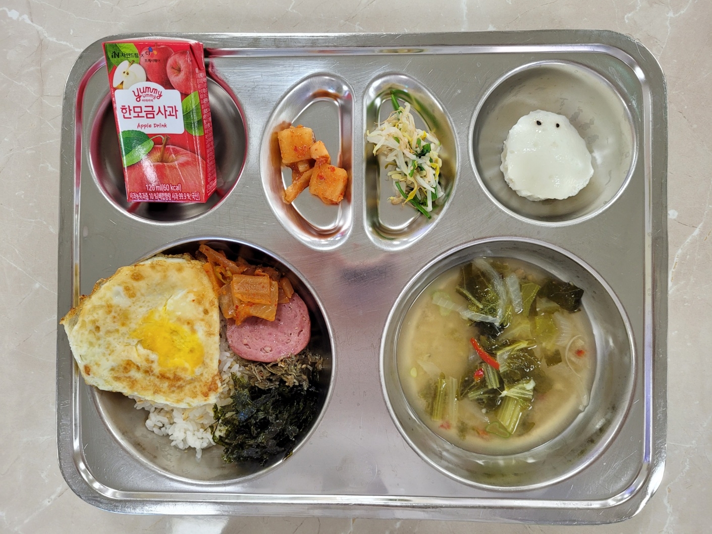2024년9월4일 (수) 식단: 옛날도시락, 단배추된장국, 숙주미나리무침, 깍두기, 미니사과쥬스, 방을증편
