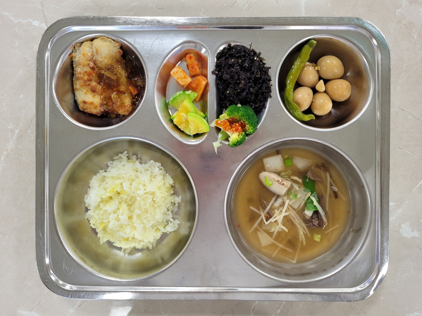 2024년9월5일 (목) 식단: 강황쌀밥, 쇠고기무국, 메추리알조림, 애호박나물, 삼치구이/양념장, 수제파래김자반, 깍두기, 브로콜리초고추장(자)