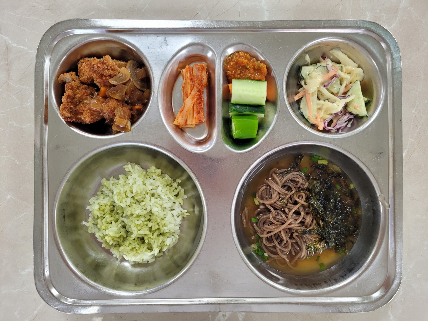 2024년9월6일 (금) 식단: 클로렐라쌀밥, 미니냉메밀국수, 양배추샐러드, 수제돈까스, 배추김치, 오이고추쌈(자)