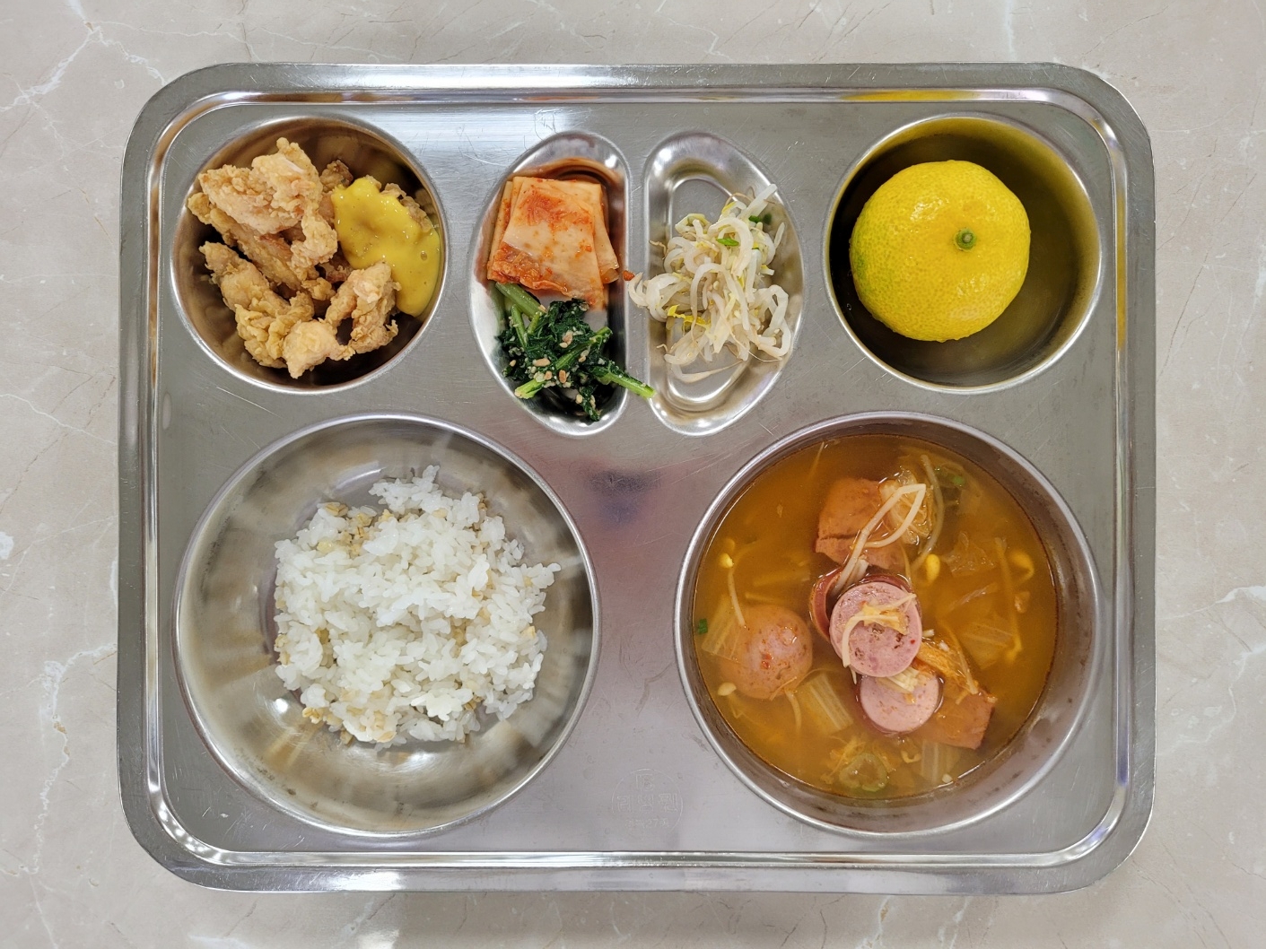2024년9월9일 (월) 식단: 찰보리밥, 부대찌개, 숙주나물무침, 수제치킨텐더, 배추김치, 쑥갓무침(자), 귤