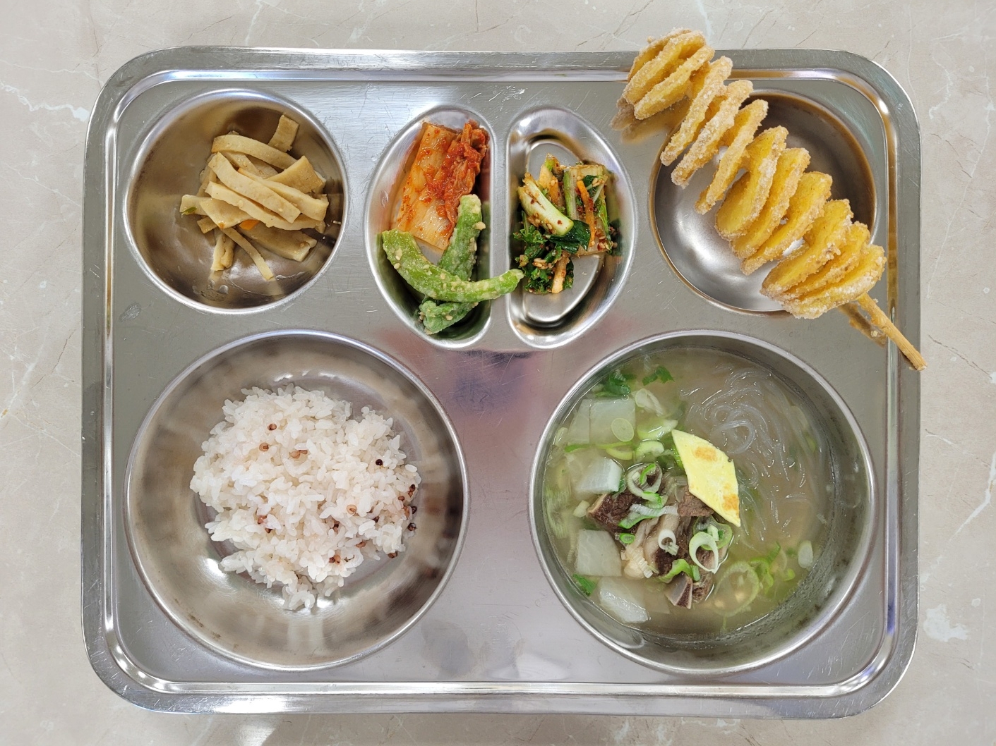 2024년9월10일 (화) 식단: 차수수밥, 갈비탕, 꽈리고추찜(자), 모듬야채겉절이, 어묵채볶음, 배추김치, 회오리감자