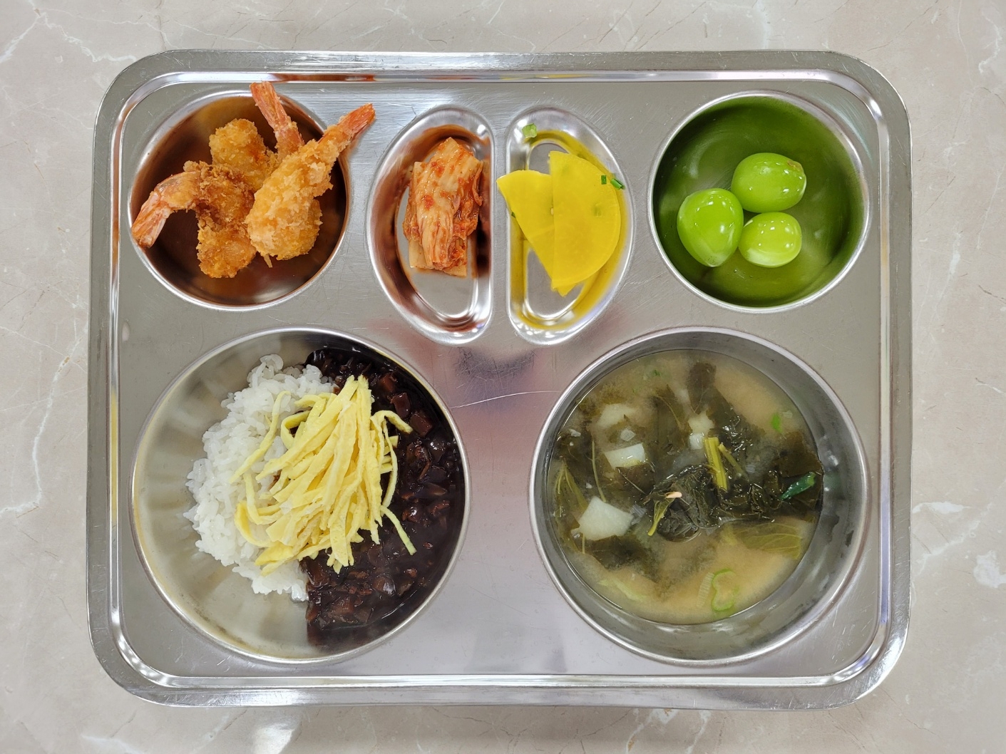 2024년9월12일 (목) 다채롭데이 식단: 다채지단자장밥, 아욱국(건새우), 슬림단무지무침, 토페이도새우튀김, 배추김치, 청포도