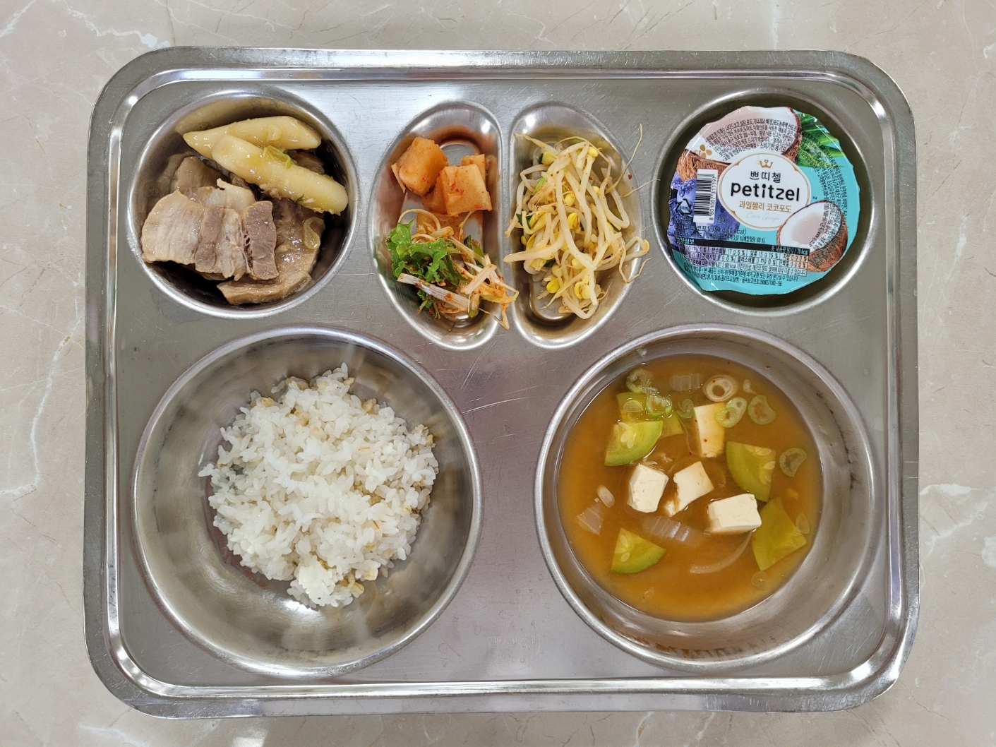 2024년9월13일 (금) 식단: 찰보리밥, 호박고추장찌개, 가래떡동파육, 콩나물무침, 치커리파절이, 깍두기, 코코포도젤리