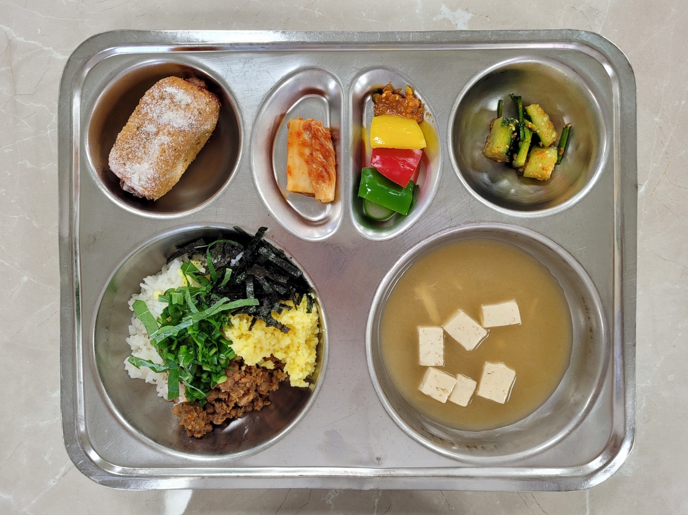 2024년9월25일 (수) 식단: 마제덮밥, 미소국, 오이소박이, 배추김치, 찰도그롤, 파프리카(자)