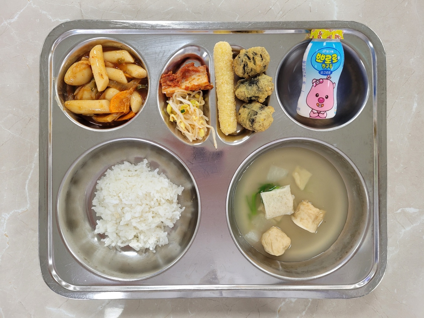 2024년9월27일 (금) 식단: 발아현미밥, 모듬어묵국, 콩나물무침, 떡볶이, 미니찹쌀김말이, 배추김치, 임실치즈스틱, 마시는요구르트