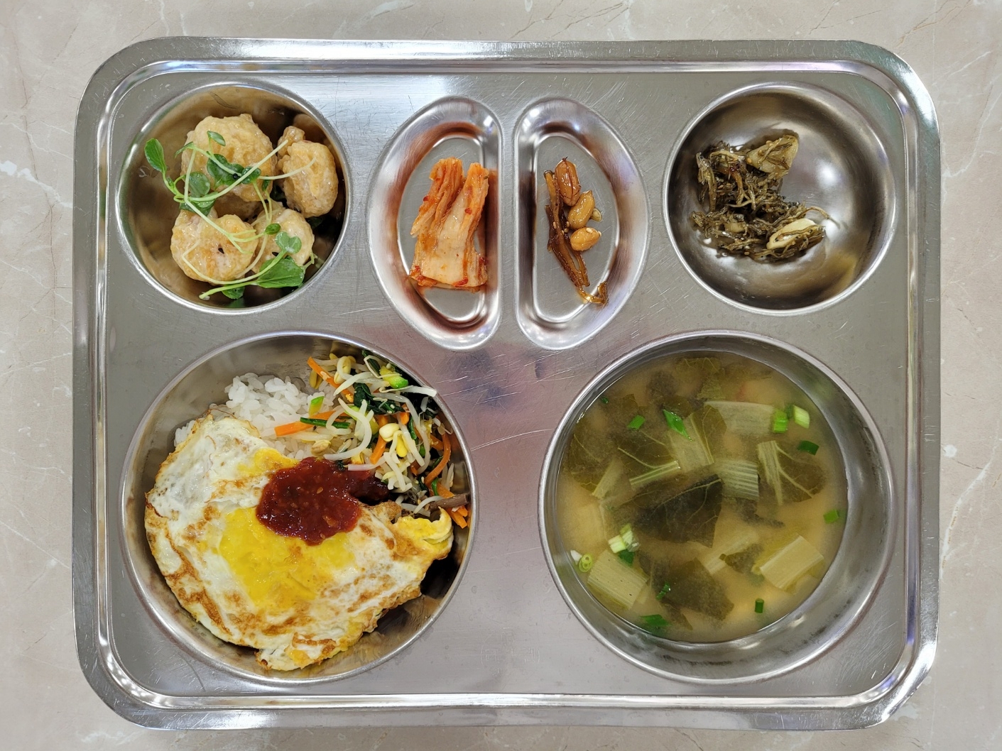 2024년9월30일 (월) 다채롭데이 식단: 오색나물비빔밥/계란구이/고추장, 단배추된장국, 우엉땅콩조림(자), 마늘편멸치볶음, 레몬크림새우, 배추김치