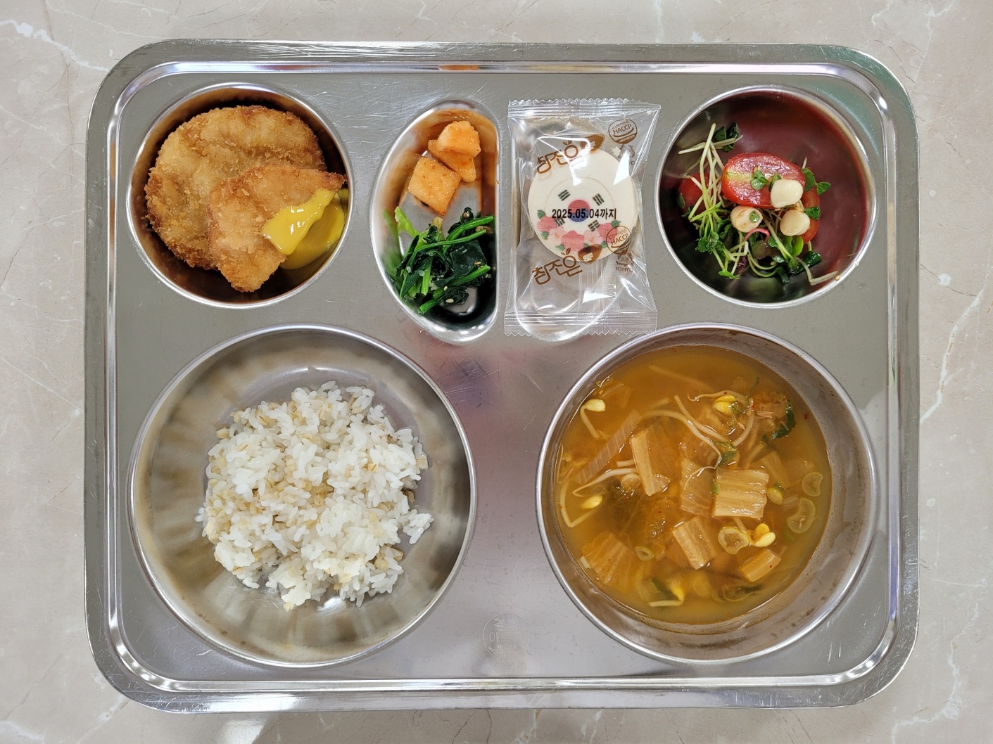 2024년10월2일 (수) 다채롭데이 식단: 찰보리밥, 참치김치찌개, 방울토마토카프레제, 통살새우까스, 시금치나물, 깍두기, 태극기우유마카롱