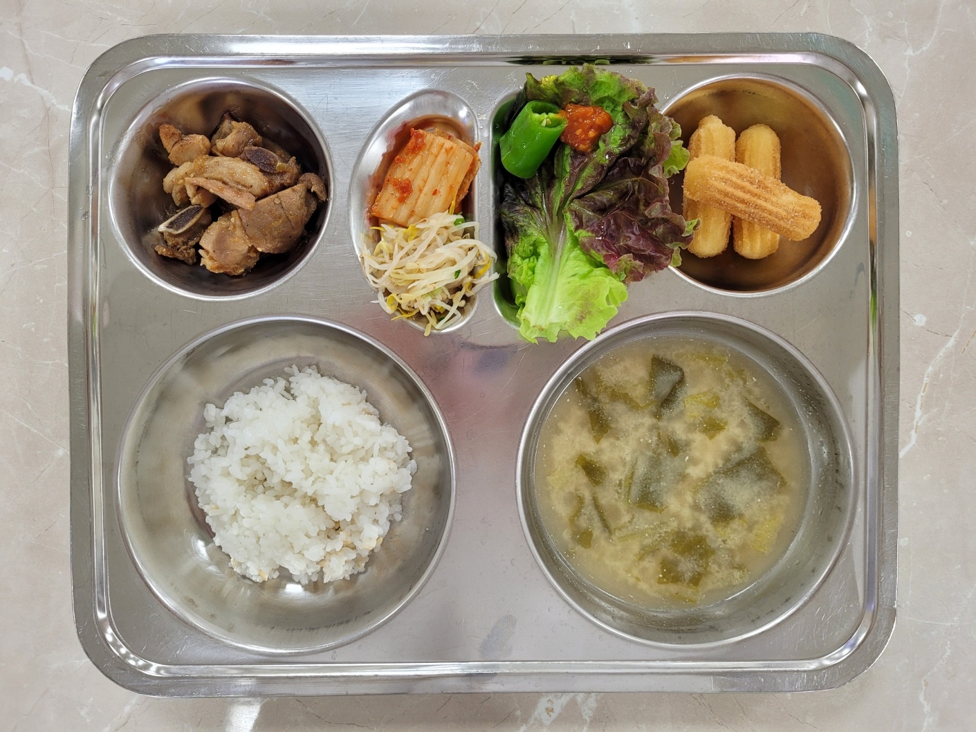 2024년10월7일(월)식단: 발아현미밥, 들깨우거지국, 숙주나물무침, 돼지갈비오븐구이, 상추/쌈장, 배추김치, 한입츄러스
