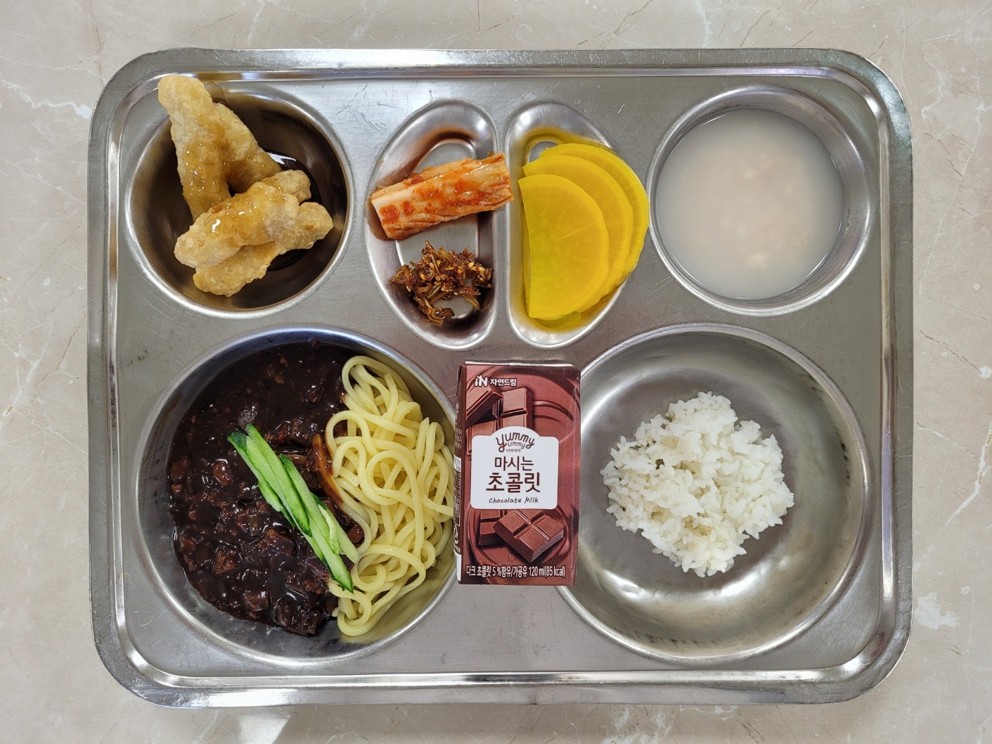 2024년10월11일 (금) 식단: 쌀밥(자), 우리밀짜장면, 멸치고추장볶음, 고소한탕수육, 단무지, 배추김치, 누룽지탕(자), 마시는초콜릿
