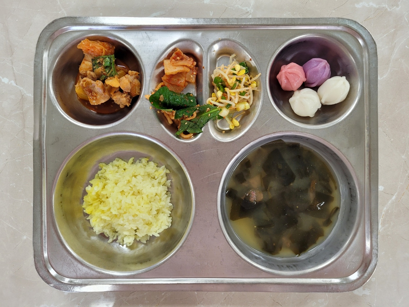 2024년10월16일 (수) 식단: 강황쌀밥, 쇠고기미역국, 참나물무생채(자), 콩나물무침, 뼈없는닭갈비, 배추김치, 꿀떡
