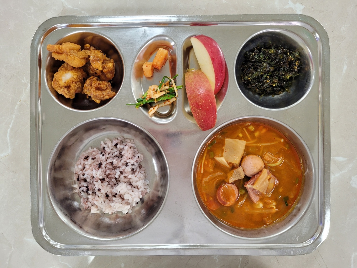 2024년10월18일 (금) 식단: 발아흑미밥, 부대찌개, 양배추부추무침, 반반치킨(간장,후라이드), 수제파래김자반, 깍두기