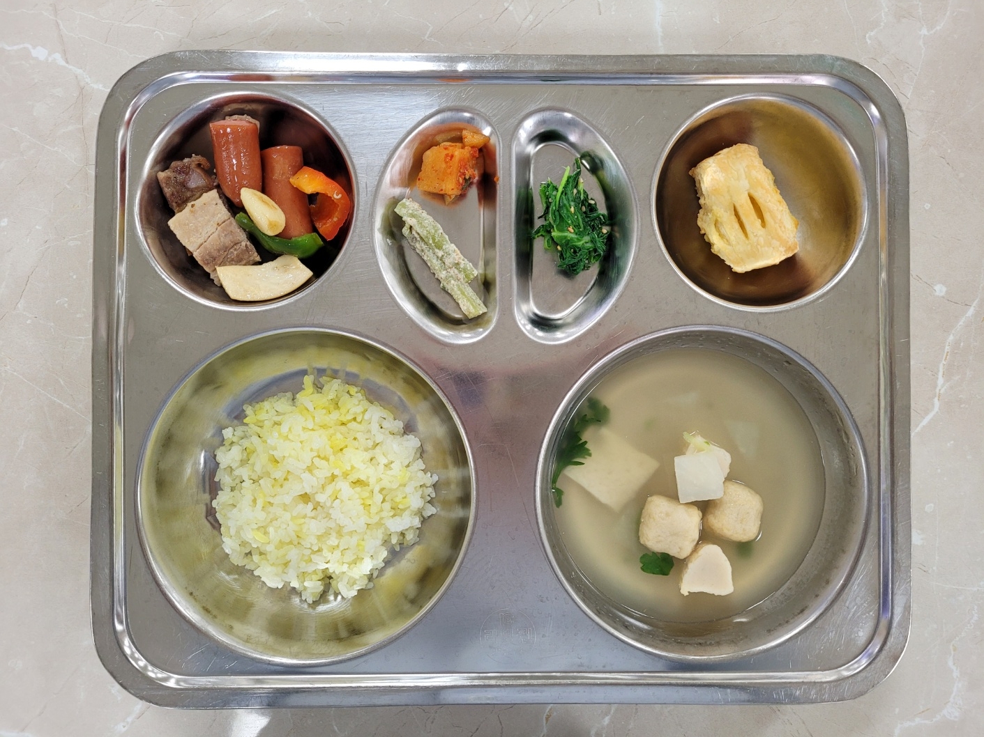 2024년10월21일 (월) 식단: 강황쌀밥, 모듬어묵국, 얼갈이부추겉절이, 궁채들깨볶음(자), 캠핑모듬구이, 깍두기, 고구마파이